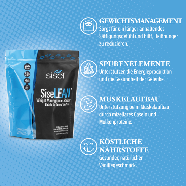 SiseLean ™ Gewichtsmanagement-Unterstützungsshakes füllen die Ernährungslücken, die bei Diäten und Training verbleiben. Es ist ein kalorienarmer, leckerer Shake, der dich satt macht und dich durch deinen Tag bringt.
