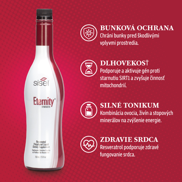 Eternity® je ideálny názov pre tento koncentrovaný elixír, ktorý zaplaví Vaše telo vysokým obsahom antioxidantov, vrátane Resveratrolu – ide o zložku, ktorá rieši každodenný boj, ktorému všetci čelíme; tzv. oxidačné poškodenie škodlivými voľnými radikálmi.