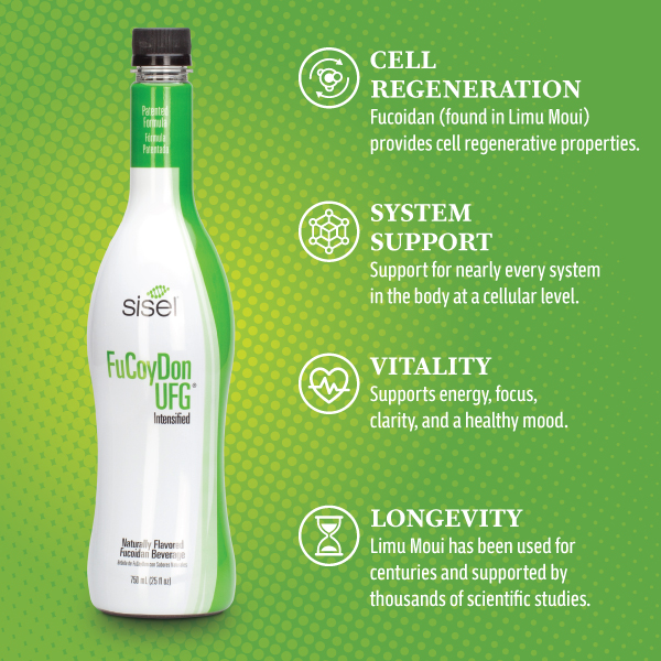 FuCoyDon UFG® is an extremely powerful, bioavailable, restorative, liquid supplement. It contains the power-packed super nutrient, fucoidan, which is abundantly found in the brown seaweed Limu Moui, that has been used for centuries to promote good health throughout the South Seas region. Sisel’s Limu Moui is grown and sustainably harvested from the pristine waters off the coast of Tonga, then is frozen immediately after harvesting to preserve its nutritious value and active components.