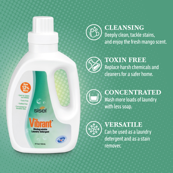 Don’t let another wash day pass using ordinary laundry detergent. Clean, concentrated, and nontoxic to you and your family. Let Vibrant Laundry Detergent make your home a Sisel-Safe® home today.