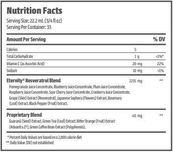 Eternity ist reich an Resveratrol sowie an bewährten antioxidativen Fruchtextrakten aus Granatapfel, Heidelbeeren und weiteren Beeren. Eternity wurde entwickelt, um Ihre Zellgesundheit zu unterstützen und zu schützen, Ihr Herz-Kreislauf-System zu stärken, gesunde Cholesterinwerte zu fördern und ein ausgewogenes Gewichtsmanagement zu unterstützen. Bei regelmäßiger Einnahme kann Eternity zu mehr Langlebigkeit beitragen und so ein längeres, gesünderes Leben unterstützen.