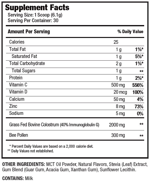 Experience the ultimate wellness boost with our advanced Colostrum formula, enriched with Bee Pollen, Vitamin C, Vitamin D, and Zinc. Unlock enhanced vitality and resilience with each serving, and embrace a healthier, more vibrant you.*