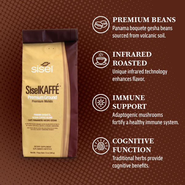 SiselKAFFÉ Premium Ground Coffee combines Panama Boquete beans with Chaga, Ganoderma, Bacopa, and Gotu Kola for a smooth, rich flavor. Roasted with infrared technology for lower acidity and balanced taste, this coffee supports immunity, longevity, cognitive function, and respiratory health.At Sisel, we’re passionate about producing the best tasting and healthiest coffee available. We pride ourselves on using only the best beans and roasting methods, no matter the cost. Coffee enthusiasts will know after the first sip that SiselKAFFÉ™ Premium is the coffee that most people will love. They will then not settle for anything less.