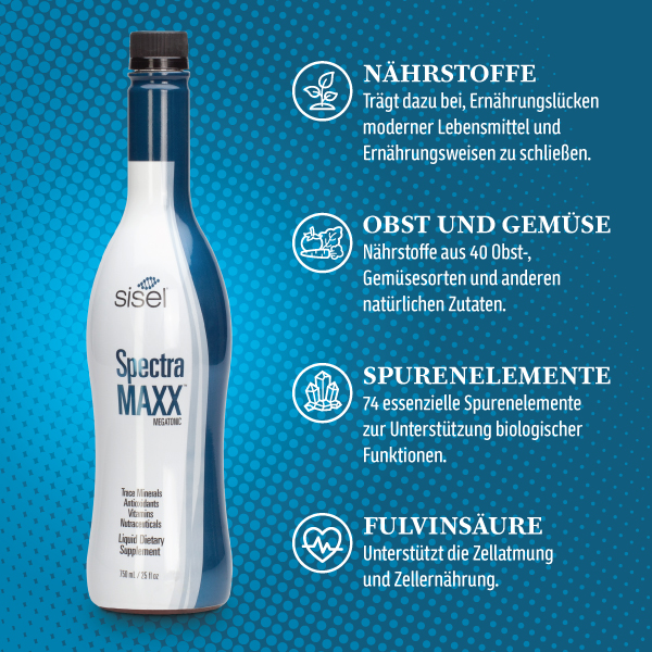 SpectraMaxx® ist die ultimative Antioxidanzien- Spurenelement-Formel, die super konzentriert ist, um für alle unsere Zellen und lebenswichtigen Organe bioverfügbar zu sein. Der Körper braucht die richtigen Nährstoffkomponenten, um sein genetisches und biologisches Potential zu entfalten. Wenn wir zuwenig Nährstoffe aufnehmen, ist der Körper für Entzündungen, degenerative Prozesse und Stoffwechselerkrankungen anfällig. Damit essentielle biologische Prozesse ablaufen können, müssen die richtigen Vitamine und Spurenelemente vorhanden sein. SpectraMaxx® liefert 40 hochwirksame Antioxidanzien und 74 Spurenelemente. SpectraMaxx® hilft bei der Bekämpfung von mehr als 2200 freier Radikale, die uns täglich bombardieren und liefert den notwendigen Treibstoff, um wichtige Stoffwechselprozesse im Körper zu aktivieren. Die Fruchtextrakte versorgen uns mit Ellagsäure – ein weiteres potentes Antioxidans für mehrere gesundheitliche Belange.
